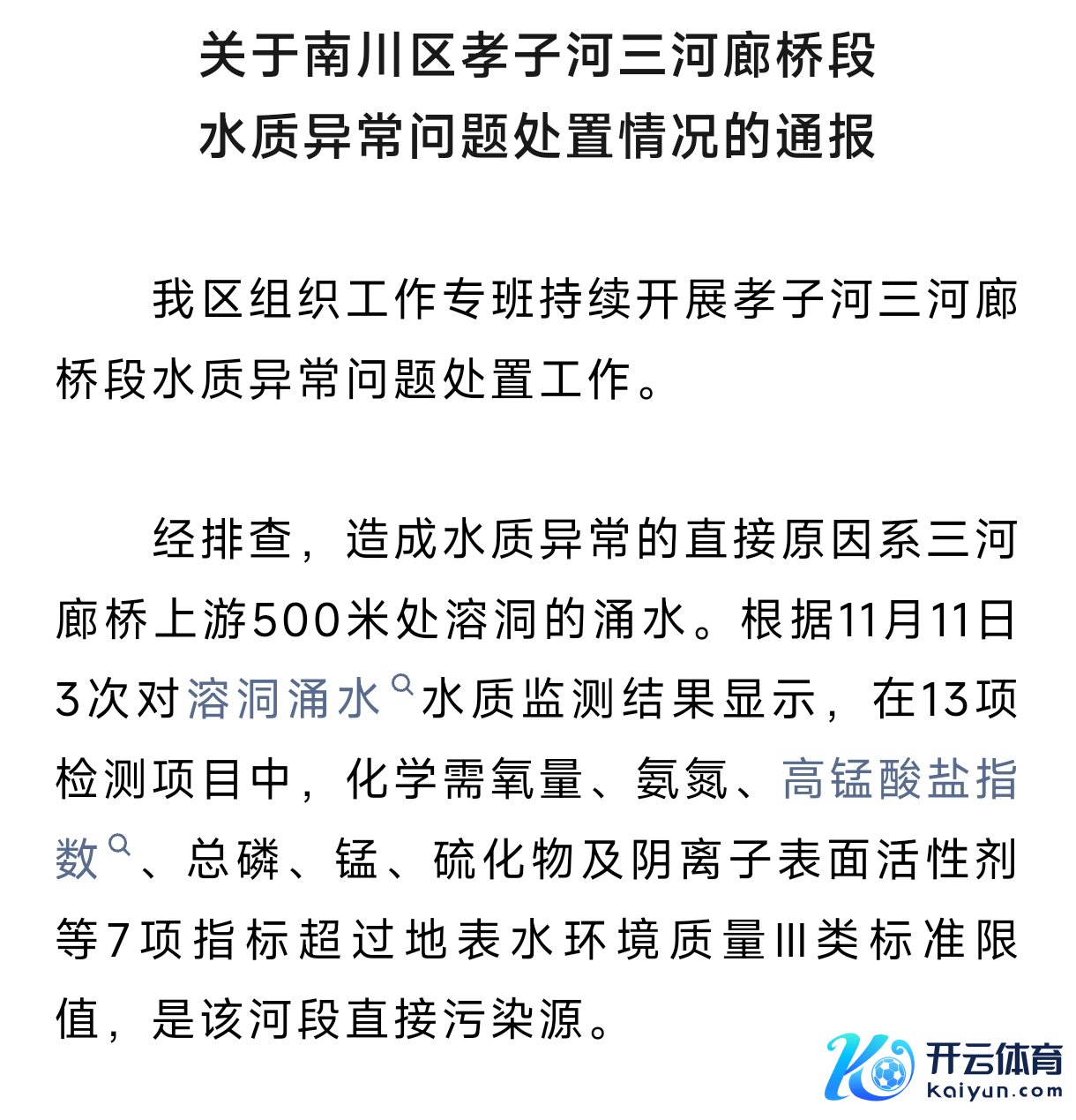 12日,南川区东说念主民政府再次发布通报,称形成水质特地的径直原因系三河廊桥上游500米处溶洞的涌水。