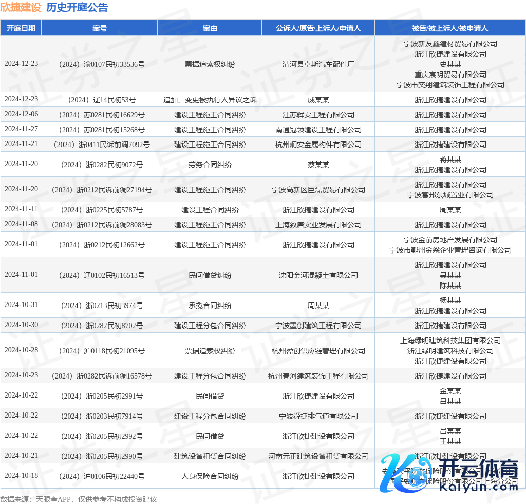案号:(2024)浙0212民诉前调27194号审理法院:宁波市鄞州区东说念主民法院案由:开垦工程施工协议纠纷当事东说念主信息: 原告/上诉东说念主:宁波高新区巨磊营业有限公司 被告/被上诉东说念主:浙江欣捷开垦有限公司、宁波富邦东城置业有限公司开庭日历:2024年11月20日凭证统计,近一年内以浙江欣捷开垦有限公司为当事东说念主的历史开庭公告有360则,其中案由为“买卖协议纠纷”的公告以132则居首,其次为“开垦工程施工协议纠纷”有41则,“开垦工程分包协议纠纷”有39则。历史开庭公告(前20条)如下: