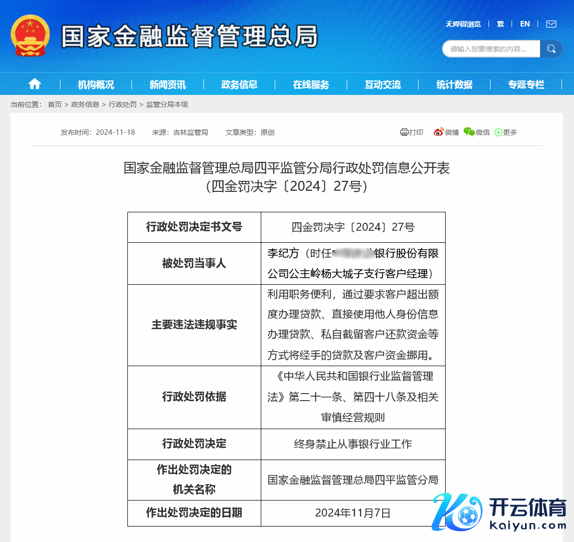 11月18日,国度金融监管总局官网涌现,某国有大行客户司理李纪方,因为诳骗职务便利,通过条件客户超出额度办理贷款并挪用等积恶非法事实,被赐与终生抨击从事银行业职责的责罚。