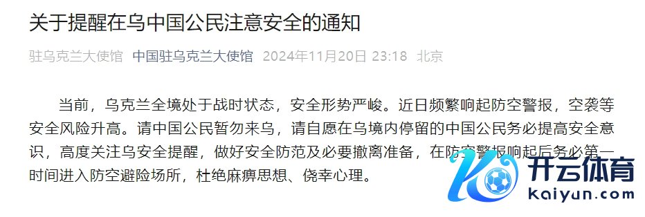 中国驻乌克兰大使馆默示,现时,乌克兰全境处于战时现象,安全阵势严峻。近日等闲响起防空警报,空袭等安全风险升高。请中国公民暂勿来乌,请自觉在乌境内停留的中国公民务必提升安全清爽,高度情怀乌安全教导开云体育,作念好安全慎重及必要撤回准备,在防空警报响起后务必第一工夫干涉防空避险时事,阻绝麻木想想、荣幸心思。