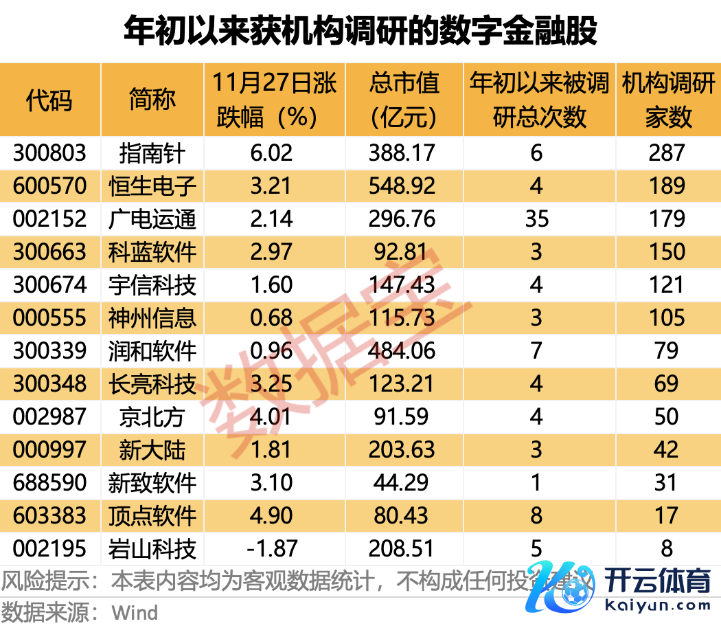 部分数字金融办法股备受机构关切。据数据宝统计,13只数字金融股年头以来得回机构调研,以机构调研派系来看,指南针累计得回287家机构调研居首;恒生电子、广电运通、科蓝软件等均得回150家以上机构调研。