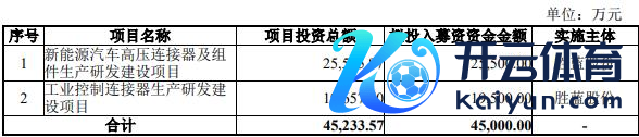 公司本次向不特定对象刊行可转债召募资金总数不跨越45,000.00万元(含),扣除刊行用度后将用于新动力汽车高压贯穿器及组件坐褥研发确立表情、工业罢休贯穿器坐褥研发确立表情。