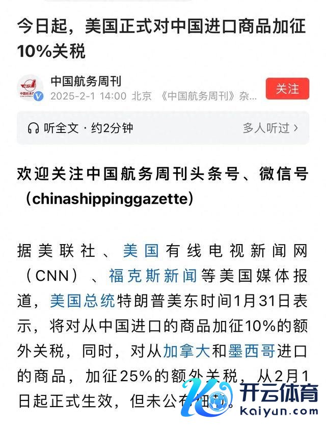 2025年2月1日开yun体育网,据好意思联社、好意思国有线电视新闻网(CNN)、福克斯新闻等好意思国媒体报谈,好意思国总统特朗普好意思东时期1月31日示意,将对从中国入口的商品加征10%的特等关税,同期,对从加拿大和墨西哥入口的商品,加征25%的特等关税开yun体育网,从2月1日起发扬成效,但未公布细节。