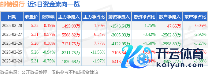 本站音信,放肆2025年2月28日收盘,邮储银行(601658)报收于5.32元,高涨0.19%,换手率0.25%体育游戏app平台,成交量165.6万手,成交额8.81亿元。